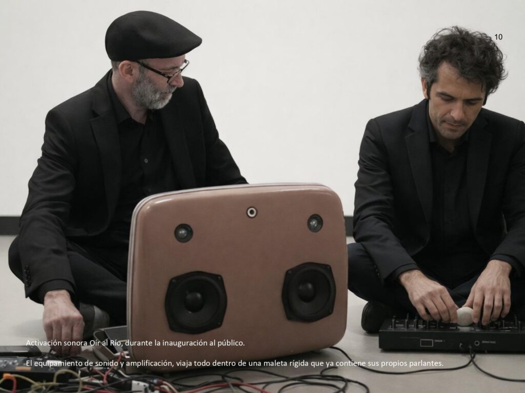 En el centro de la propuesta se encuentra la instalación “Oír al río”, una obra que utiliza piedras extraídas del cauce del río Uruguay como elementos sonoros que activan una memoria acústica del territorio. Estas piedras funcionan como archivos materiales de la historia del paisaje fluvial y, a través de dispositivos tecnológicos, producen una experiencia de escucha que invita a reflexionar sobre las relaciones entre territorio, historia y experiencia sensible.
